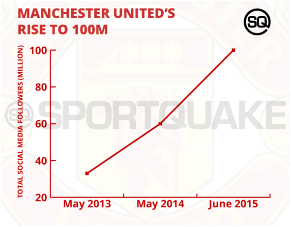 United’s social media presence has grown more than 200% in the last two years, from 33m in May 2013, despite the team failing to win any major trophies in that period.