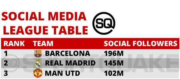 Despite being the first English team to surpass 100m followers, Manchester United’s global fanbase still lags some way behind La Liga giants Barcelona (196m) and Real Madrid (145m).