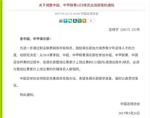 On May 24, the Chinese Football Association (CFA) introduced the strongest policies yet in a bid to curb soaring transfer fees for foreign players and to force clubs to field more U23 players on the pitch.
